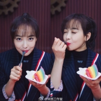 照片中的宋茜身着深蓝色的条纹西装外套,搭上一下子就映入眼帘的红色条纹裤子。再加上扎成马尾的头发,整体氛围都很可爱,很有女人味。宋茜拿着彩虹颜色的蛋糕站在写着“宋茜生日快乐”的玫瑰花墙前摆着姿势,拿着蛋糕吃的样子也散发着可爱的魅力。