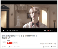 防弹少年团正规2辑《WINGS》主打曲《血汗泪》MV在YouTube点击率突破1亿,自去年10月9日在YouTube公开后仅隔了约130天。防弹少年团的《DOPE》和《FIRE》MV也已突破1亿点击率。