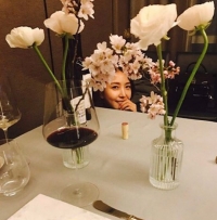 照片中的宝儿享受着CHOI.餐厅内的美食与红酒度过了愉快的时光,其中一张照片中宝儿躲在装饰花后依然亮眼的她散发着可爱魅力。