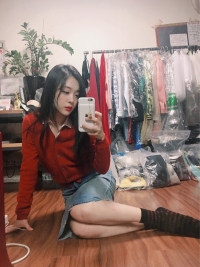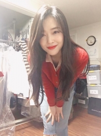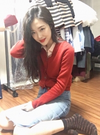 公开的照片看得出来是在衣帽间拍摄的。照片中身着红色针织衫搭配牛仔裙的雪莉坐在镜子前摆着姿势自拍,把头发撩到一边并露出微笑的样子十分迷人。