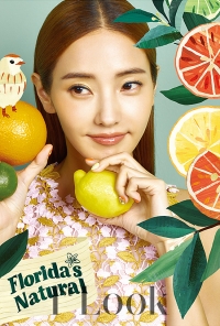 韩彩英的外貌很耀眼。韩彩英在柠檬、橙子。西柚之间开朗的笑着。一字肩的上衣使韩彩英的肩膀线条很好的显露出来。