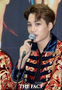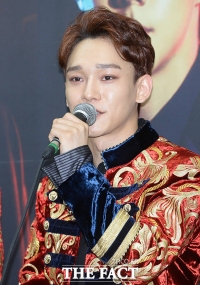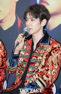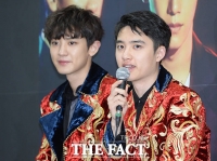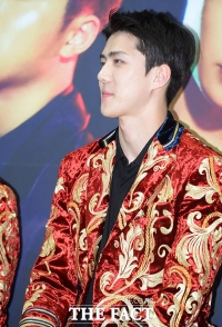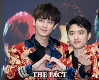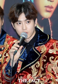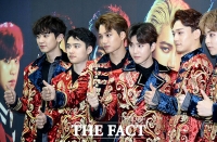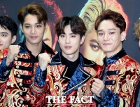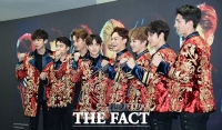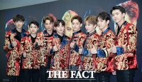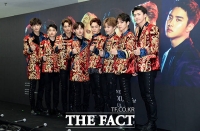 组合EXO在28号下午于首尔松坡区蚕室奥林匹克主竞技场举行了 'EXO PLANET #3 - The EXO'r DIUM dot'演唱会的记者会中成员SUHO,CHEN,XIUMIN,伯贤,世勋(从左到右)都摆出了手指心的姿势。这次演唱会是装饰EXO自去年7月以首尔为起点在全世界主要城市举行的第三次世界巡回演唱会的结尾的公演。