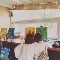 照片中有黄正音画着画的样子也有画完之后欣赏画的样子。一边胎教一边准备分娩的准妈妈黄正音的样子很新颖。