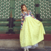 照片中的孔敏智身穿花图案的上衣搭配明黄色的裙子展示出华丽的氛围。在景福宫前摆出的娇羞姿势跟在舞台上的帅气面貌截然不同。