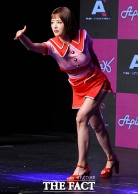 女团Apink成员尹普美于26日下午在首尔麻浦区举行的第六张迷你专辑《Pink UP》SHOWCASE上做出开球动作。