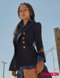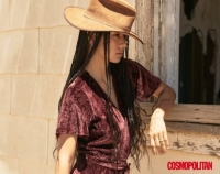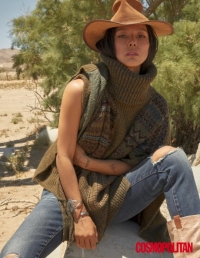 通过在热辣的太阳下的加州沙漠拍摄的画报展示了脏辫这破格的造型。画报中她配合POLP RALPH LAUREN的格子裙,针织披肩,绒面长裙等西部造型摆出西部电影中的场面般的姿势。