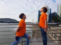 公开的照片中是身穿橙色T恤的神话成员李珉宇和ANDY以新加坡著名景点为背景摆出搞笑姿势拍着照片的样子。