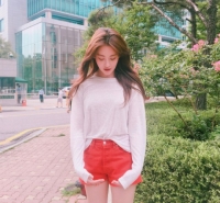 公开的照片吴涟序穿着白色T恤和强烈红色短裤。长棕发和吴涟序白皙的肌肤展示了清纯感。