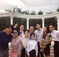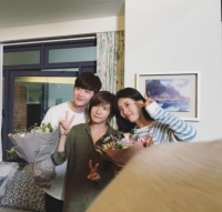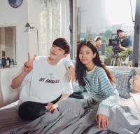 公开的照片中李钟硕和秀智一起坐在拍摄场地的床上摆着姿势。他还公开了他们还和制作团队,演员们在杀青之后带着可惜的心拍下的认证照。两人都拿着花束,秀智可爱的表情让人印象深刻。