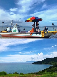 照片是tvN综艺节目“三时三餐海洋牧场篇”的拍摄现场。演员李瑞镇、尹鈞相 、Eric乘坐着瑞镇号的模样和美丽的大海风景。特别是韩志珉以宽阔的天空和蓝色大海为背景展示着清爽的微笑。