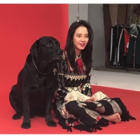 照片中宋智孝正在和大型犬正在拍摄的模样。宋智孝完美消化独特图案的服装展示了耀眼美貌。但是大型犬像是对宋智孝没有关心的模样,看着别处以及一副没兴趣的模样让人引发笑容。