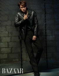 男子汉的姿势也不可或缺。黑色的皮衣加上黑色的西裤营造出冷酷的魅力。小脸加上修长的身材炫耀了他优越的比例。
