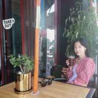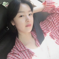 照片中韩善花穿着白色打底衫搭配红色格子衬衫展示了清新的美貌。展示了毫无瑕疵的光滑肌肤。