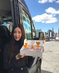 照片中是金莎朗在纽约街头拿着蛋糕摆出灿烂笑容的模样。长直发的金莎朗使美貌更加突显。