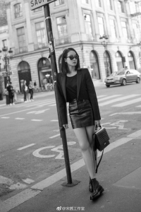 公开的照片被处理成黑白色调充满了干练的魅力。宋茜戴着独特造型的墨镜身着皮质短裙和短外套,展示了自己的时尚。