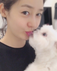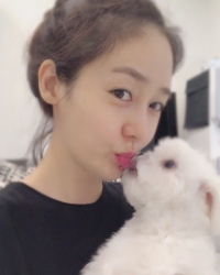 照片是成宥利对着狗狗充满爱意的亲亲模样。做出WINK和笑容的成宥利展示了妖精视觉。