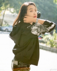 照片中的宋茜展示了自己的素颜。黑色的连帽卫衣搭配皮裤展示了舒适又时尚的造型。