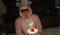 在第二张照片中,金泰东穿着粉色猪猪睡衣并拿着草莓蛋糕。