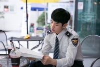 照片中丁海寅在等待拍摄时专心看着剧本、与剧中自己的宠物犬玩耍的模样。特别是不管在