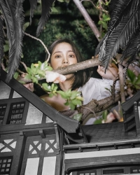 为了表现错位的空间所以她站在了黑白的建筑与翠绿的森林中间展示着自己清纯的脸。