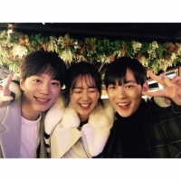 李俊英,崔圭振这两个经历差很远的前后辈之间像好朋友一样勾肩搭背拍下了搞怪的照片,两人中间的李枖原不变的童颜美貌尤其亮眼。