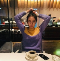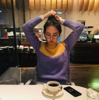 照片中安昭熙在一家咖啡店正在绑头发的模样。嘟嘴表情很可爱。