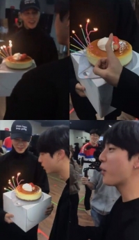 防弹少年团官方SNS 4日上传了一则视频。视频中智旻拿着蛋糕走向JIN。生日的JIN在众多同事和工作人员们的祝贺下吹了蜡烛。