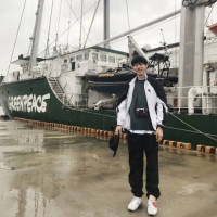 公开的照片中身着舒适服装并在脖子上挂着相机的柳俊烈站在GREENPEACE海洋探查船前摆着姿势。