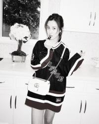 公开的照片中是以厨房为背景身着运动风服装摆着姿势的徐贤。徐贤特有的氛围以及眼神抓住了人们的目光。