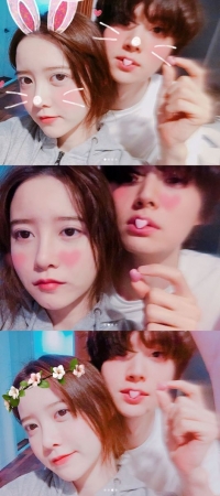 两人可爱地注视着镜头。虽然安宰贤在具惠善身后有点模糊,但是依旧能看出牛奶般的白皮肤与童颜美貌。