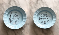 公开的照片中是夫妇俩在碟子上写的寄语。其中一个碟子写着“2018.6.24”、“于晓光”、“生意兴隆”。另一个写着“秋瓷炫”、“真的很好吃”。