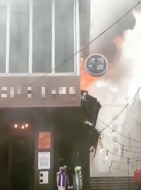 视频中可以看到Henry餐厅的上层商家发生了火灾,消防人员们正在消灭火种的画面。