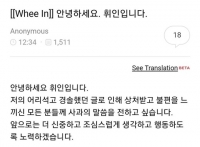 辉人于4日下午通过MAMAMOO官咖上表示:“向由于我轻率的文字而受伤的所有人说一声抱歉,日后我会努力更加谨言慎行的”。