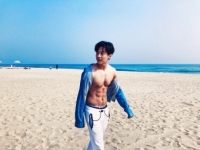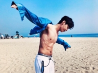 照片中的Henry在海边迎着凉爽的海风,展现出享受日常的面貌。身穿男友装般的纯白裤子和海蓝色的衬衫,更加突显暖男感。