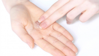 2. 使用附带面膜勺轻轻将手掌中的珍珠颗粒揉碎后,使用手指轻轻搅拌珍珠与啫喱面膜,使其充分融合。