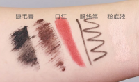 先在手上涂上睫毛膏 口红 眼线笔和粉底液