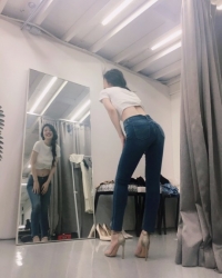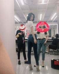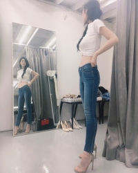公开的照片中雪莉身穿着白色T恤与紧贴着皮肤的紧身牛仔裤,完美的凸显出了腰部线条。