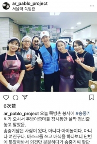 因为宋仲基的到来,厨房的阿姨们都高兴坏了。因为他戴了口罩,刚开始厨房的阿姨们没有认出来。“来了一个和宋仲基很像的人“,“不是,是个爱豆”,“也不是,是吕珍九”,就在大家这么议论纷纷的时候,仲基说没错是他,大家把手上的东西都放下了一起拍了纪念照。因为宋仲基,大家在中秋假期最后一天的志愿活动比任何时候都要开心融洽。