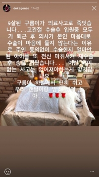 12日,Dok2在个人INS上发文表示"9岁的云朵因医疗事故去世了,因为髋关节手术入院接受了治疗。但是医生以手术结果不尽人意为由,在所有人下班后,未经主人同意对刚进行手术没多久的云朵全身麻醉后进行了二次手术,手术后云朵停止了呼吸。"