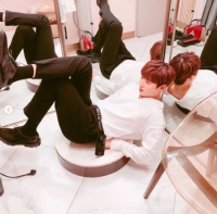 完美消化了干净利落的黑白色造型的赖冠霖凝视着远处,摆出了帅气的姿势。第二张照片中Wanna One成员黄旼泫躺在地板上,摆出的姿势与赖冠霖截然相反。