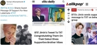 防弹少年团智旻于4日公开向后辈组合TXT的应援信息。对此引起了全世界粉丝们的热烈欢呼。Soompoi、elite daily、allkpop等海外媒体对智旻的支持进行了报道。