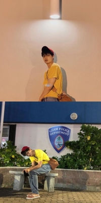 照片中,KAI在街头上摆着各式各样的姿势,身穿黄色短袖衬衫和头戴红色帽子的KAI,展示了独一无二的时尚。
