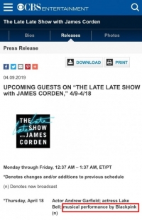 10日上午,美国哥伦比亚广播公司(CBS)方面正式宣布,"BLACKPINK将于18日(当地时间)参与《THE LATE SHOW with JAMES CORDEN SHOW》的录制。" 录制节目将于当天12时37分(东部时间)在美国全境播出。