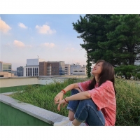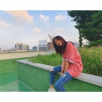楼顶的天空为背景,身穿粉色系上衣和牛仔裤,清纯的美貌吸引视线。
