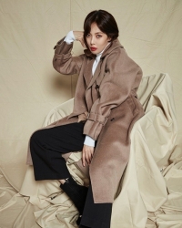 此次画报的主题是"Moment",泫雅身穿白色高领毛衣和黑色长裤,搭配驼色外套,展示了迷人又干练的形象。
