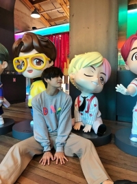 公开的照片中,金泰亨在人偶前面摆着和人偶一样的姿势。包括v在内的防弹少年团成员们最近访问了位于首尔的防弹少年团pop - up store,并公开了纪念照片。