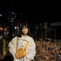 金惠允穿着白色羊毛毛绒夹克,背着芥末黄色的斜挎包