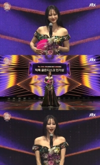 本月5日,韩艺瑟作为金唱片人气奖的颁奖嘉宾登场,以露肩礼服搭配深色烟熏妆和鼻环的破格造型吸引了视线,并随后登上实时检索词。