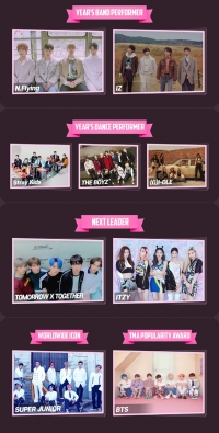 在表演部门,Stray Kids、THE BOYZ和(G)I-DLE获得了[年度舞蹈表演者],N.Flying和IZ获得了[年度乐队表演者]。