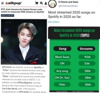 防弹少年团智旻在发表第四张正规专辑第37天,以单曲《Filter》在全球最大的流行乐网站“Sportify”上创下了韩国单曲中最短时间内达成3000万播放量的新纪录。